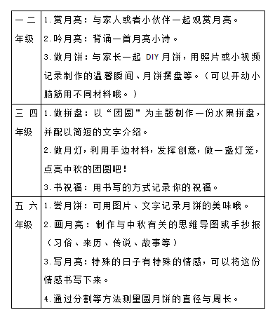 三四年级的同学们,可以与爸爸妈妈一起查资料、猜灯谜、制贺卡、做月饼、话中秋,度过一个与以往不一样的中秋节。